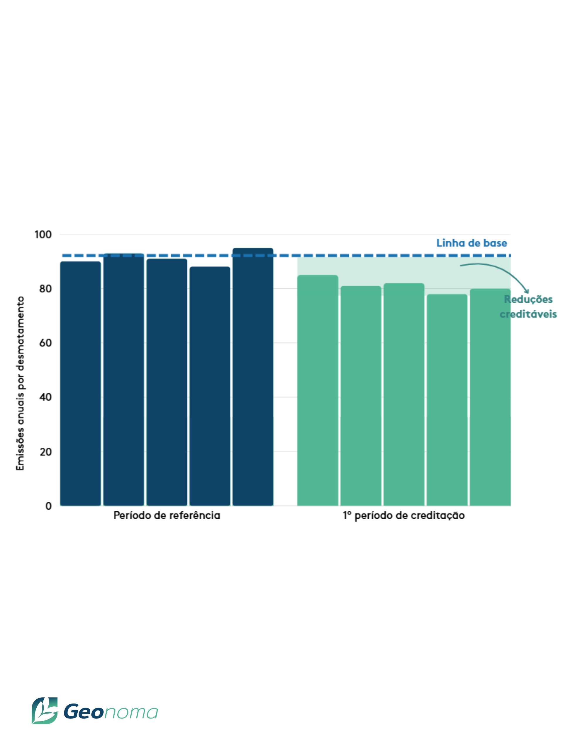 A redução das emissões é calculada usando um período de referência. O chamado período de referência é composto pelos 5 anos anteriores ao início do programa. A linha de base é calculada pela média das emissões anuais por desmatamento nesse período. Para o período de creditação, a diferença entre a linha de base e as emissões verificadas resulta nas reduções creditáveis, que determinam quantos créditos de carbono podem ser emitidos. A cada 5 anos, a linha de base é atualizada, exigindo a contínua redução de desmatamento para que continuem sendo gerados créditos.